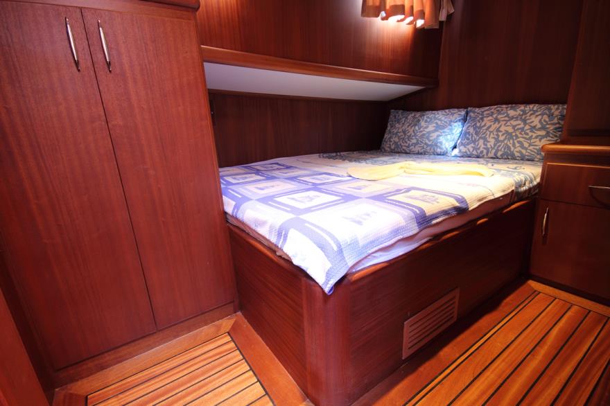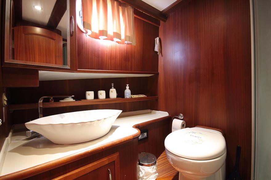 The boat has 3 cabins for up to 6 pax. 1 master cabin is located at the aft and 2 double cabins are in front. There is also 1 separate crew cabin for 2 pax in front and 1 captain cabin for 1 person inside the boat next to master cabin at the aft.